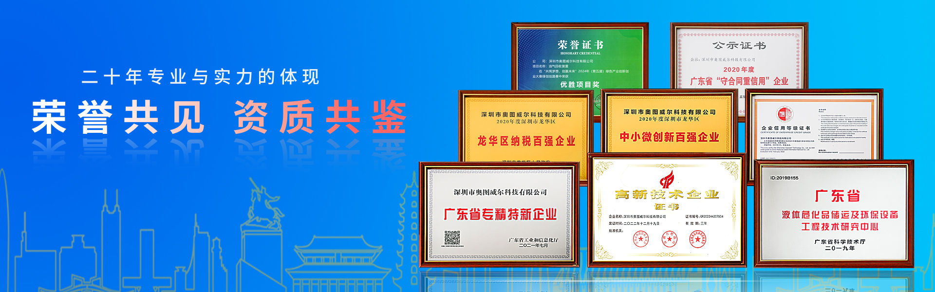 深圳市奧圖威爾科技有限公司創立于2003年。公司總部座落于全球極具經濟與創新活力的粵港澳大灣區核心城市—深圳,是國家級高新技術企業、廣東省專精特新企業、龍華區中小企業納稅百強企業、龍華區中小企業創新百強企業,并被認定為廣東省危化品智能儲運及環保設備技術研究中心、深圳市兩化融合貫標企業。